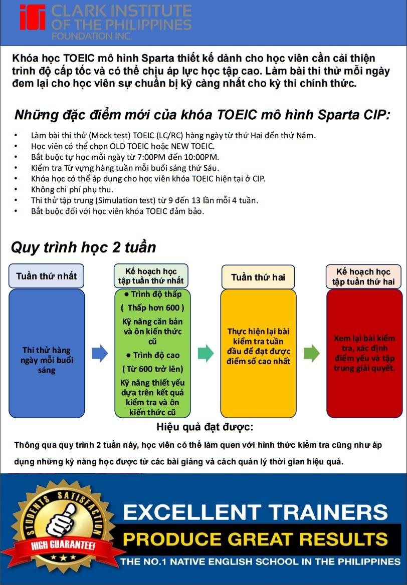 Giờ đây bạn có thể học tập TOEIC Sparta tại CIP, Clark mà không phải đi đến tận Baguio – vùng đất nổi tiếng với các trường Anh ngữ theo mô hình Sparta!