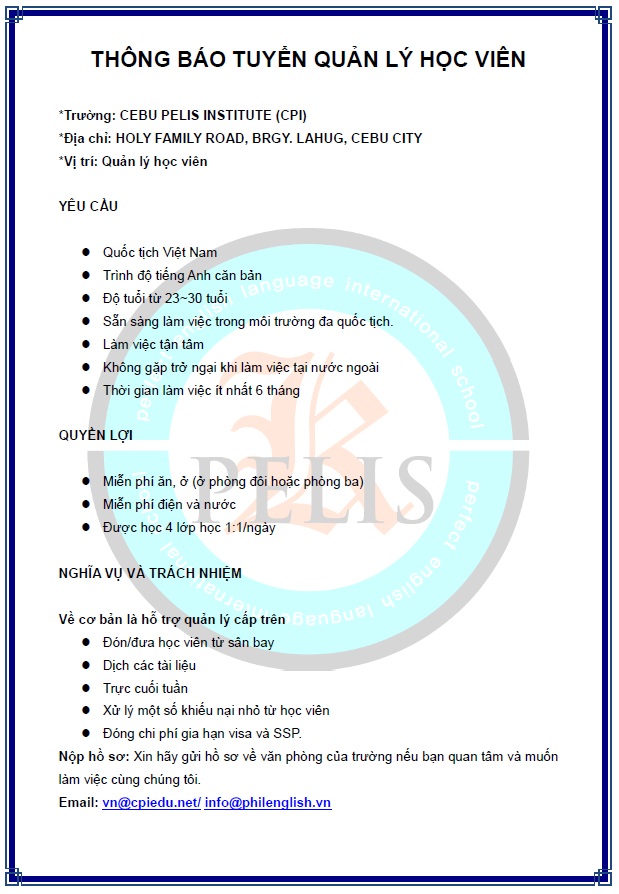 Cebu Pelis Institute (CPI) – một trong những trường Anh ngữ hàng đầu tại thành phố Cebu, Philippines, vừa chính thức công bố kế hoạch tuyển dụng nhân sự cho nhiều vị trí trong năm nay. CPI được biết đến là ngôi trường sở hữu khuôn viên rộng lớn, ký túc xá cao cấp, hồ bơi ngoài trời và hệ thống phòng học hiện đại bậc nhất Cebu. Trong suốt nhiều năm qua, CPI không chỉ gây ấn tượng bởi chất lượng đào tạo mà còn bởi môi trường sống và làm việc lý tưởng – nơi các nhân sự được tôn trọng, phát huy năng lực và gắn bó lâu dài.